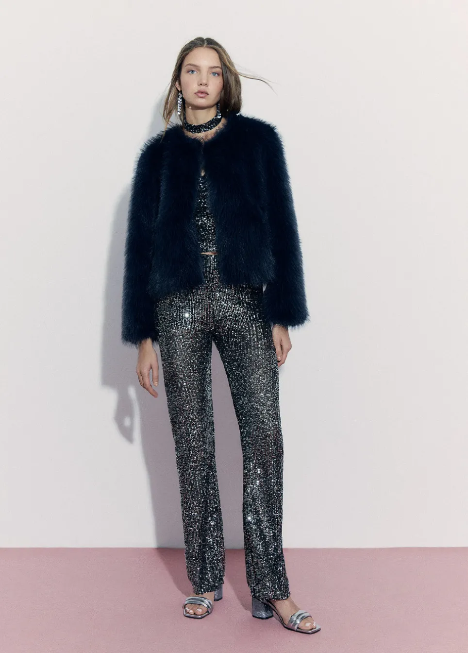 Abrigo Corto De Pelo Sintetico De Manga Larga Y Cuello Redondo.Composicion: