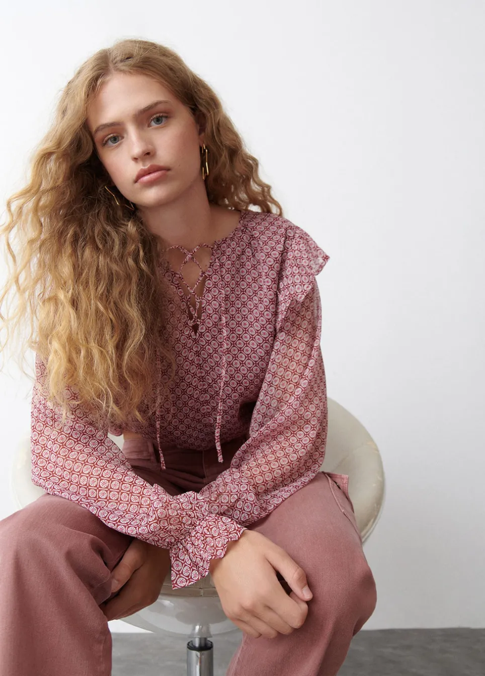 Blusa Cropped Estampada De Manga Larga Abullonada, Cuello De Pico Con Detalle De Acordonado Y Volantes.Composicion: