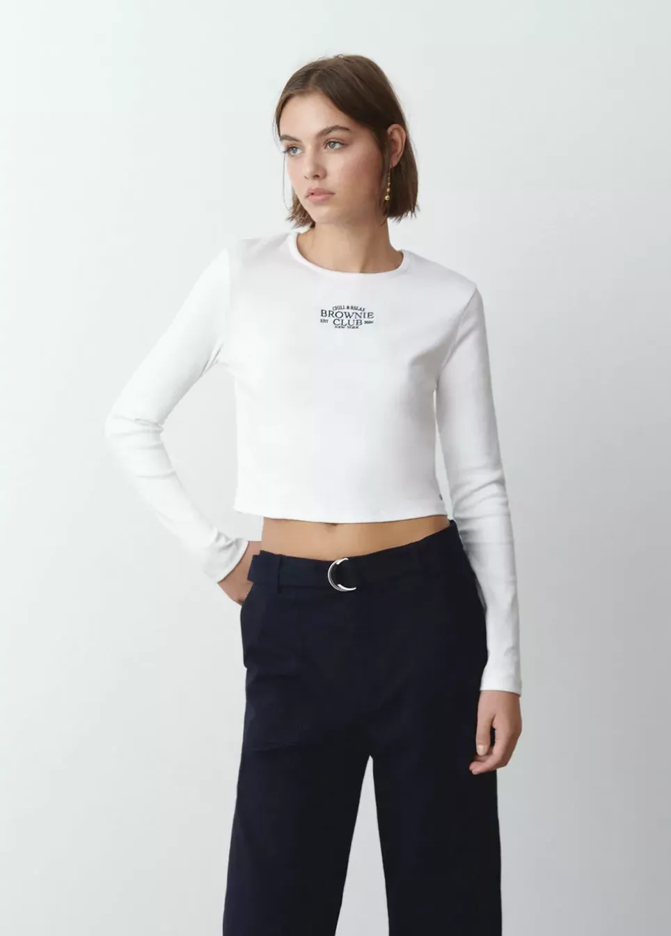 Camiseta Cropped De Manga Larga, Cuello Redondo Y Mensaje En El Frontal.Composicion: