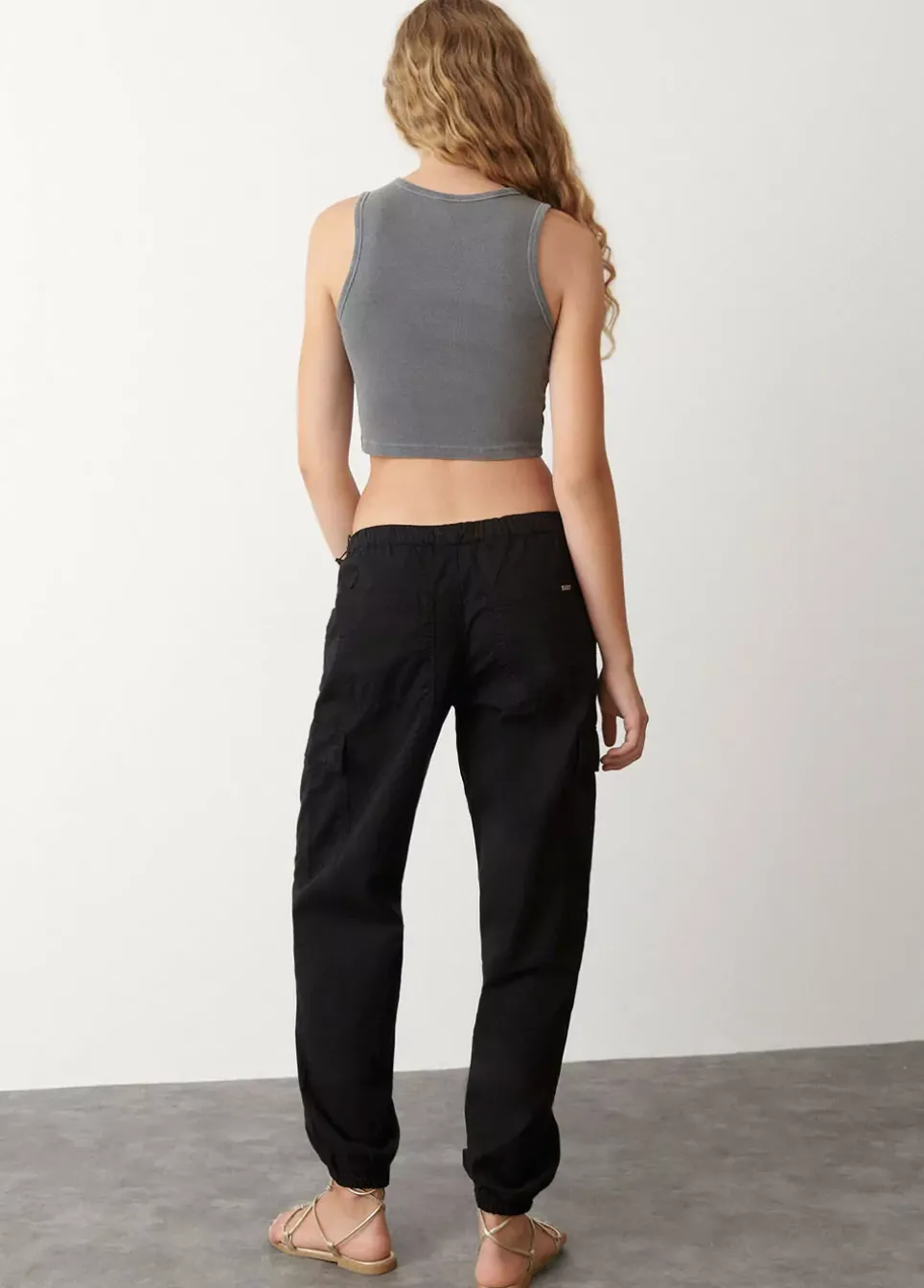 Pantalon De Tiro Medio Parachute Largo Fluido, Tipo Cargo Con Bolsillos Y Cierre De Goma Ajustable Tanto En La Cintura Como En Los Tobillos.