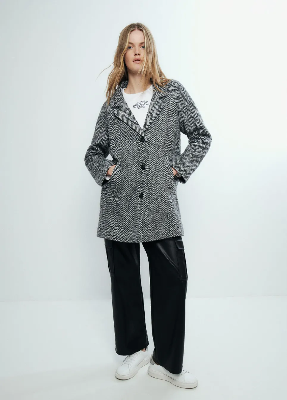 Abrigo Midi De Pano Estampado De Espiga De Manga Larga, Cuello Con Solapas, Bolsillos Y Cierre Mediante Botones En El Frontal.Composicion: