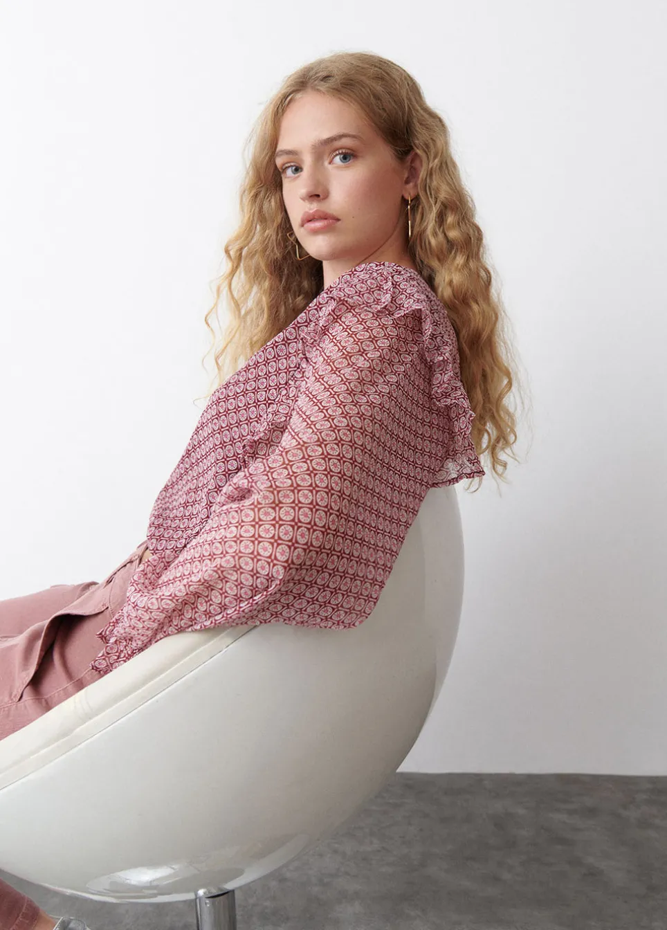Blusa Cropped Estampada De Manga Larga Abullonada, Cuello De Pico Con Detalle De Acordonado Y Volantes.Composicion: