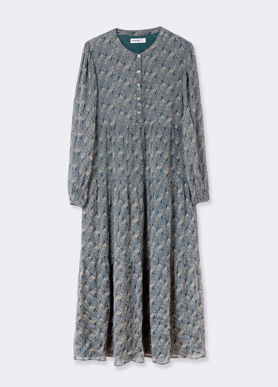 Vestido Largo Estampado De Manga Larga Abullonada, Cuello Redondo, Detalle De Botones En El Frontal Y Volantes.Composicion: